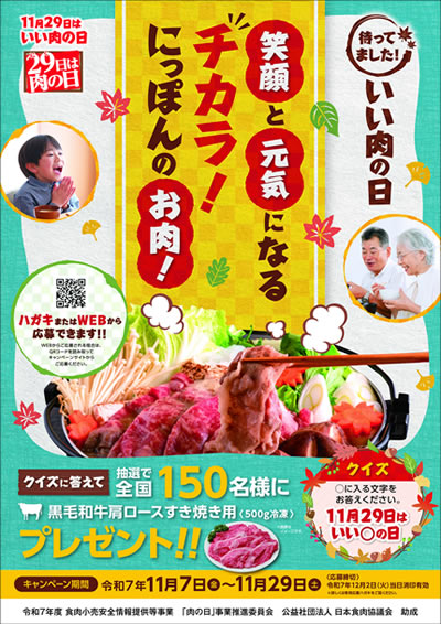キャンペーン期間:令和7年11月7日(金)~29日(土) クイズに答えて抽選で150名に黒毛和牛肩ロースすき焼き用500g冷凍をプレゼント