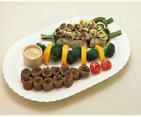 特徴 : 「トクサム」という、焼き肉を薄いお餅で巻いて食べる韓国料理をライスペーパーで再現しました。 生春巻きには、ビーフンが入ることが多いので、それを春雨料理(チャプチェ)で代替えし、韓国風 に仕上げました。