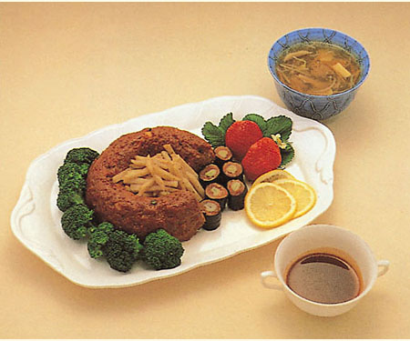 特徴 : ほどよい歯ごたえとコクが特徴である地鶏「阿波尾鶏」を使用し、豆腐のフワフワ感、レンコンのシャキシャキ感を生かしました。味噌と大葉をアクセントにした、冷めてもおいしいハンバーグです。