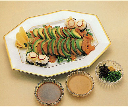 特徴 : あまり調理では使わない鶏セセリを使用し、北海道のネバリの強いがごめ昆布と長芋に、 わさびとゆずと大葉で、香り豊かに仕上げました。