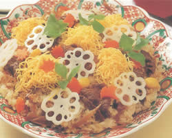 甘辛く煮た牛肉といり大豆がマッチしたごちそうずしです。彩が美しく春の瀬戸内海の島々を表現しています。