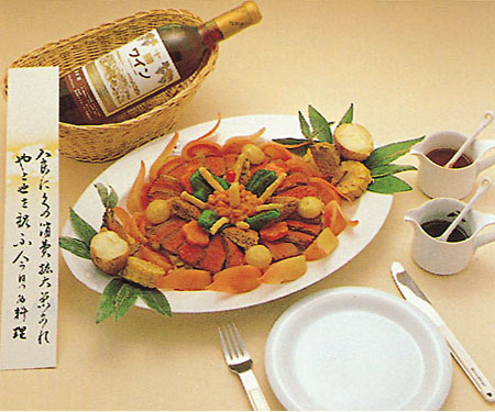大分県特産のしいたけ、かぼす、町特産の安心院ワインにこだわりました。フレッシュハーブとワインを使いましたので、さっぱりとした味でいただけます。