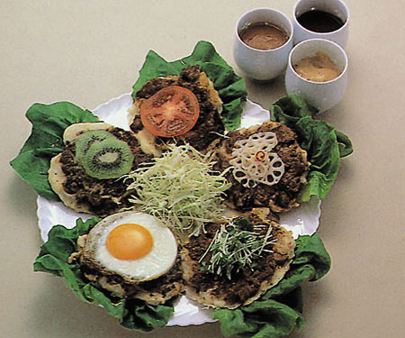 豚、牛、鶏の3種の味が楽しめる揚げ物です。レモンを絞り丹波きなこをつけて頂きます。天ぷらで抹茶と塩で頂くところからヒントを貰いました。 (兵庫産豚、三田牛、但馬鶏、玉ねぎ)