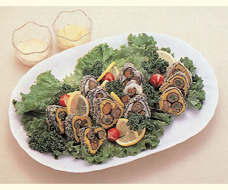 <審査委員からのひとこと>開港150周年を記念してできた「たねまる」キャラクターを飾り巻きずし風に牛肉で巻いた楽しい作品です。(梅村) |