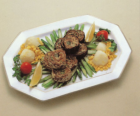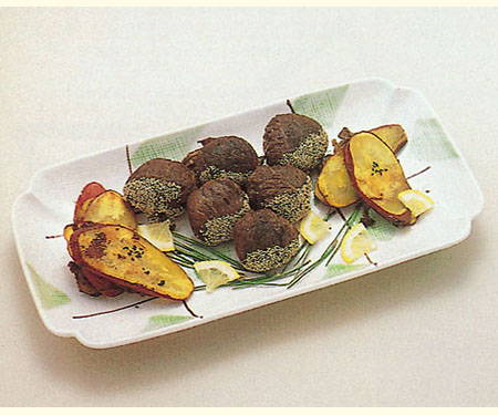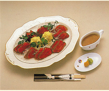 特徴 : 牛もも肉でアボカドを包むことで、しっかりとした食感の牛もも肉の中から噛んだ瞬間に、 とろけるようなアボ力ドがあふれ出します。 特製の「越(こし)のルビーソース」をかければ、より一層おいしく召し上がっていただけます。