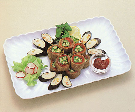特徴 : 氷見牛とご飯と野菜といっしょに食べることができとてもおいしいです。 パーティー用の一品としても便利かと思います。また、氷見牛のしっとりとしたおいしさと富山県特産の白エビの天ぷらのシャキシャキ感とのコラボも特徴です。 食べやすさを考え、こぶりに仕上げました。