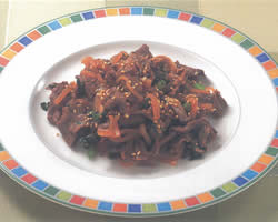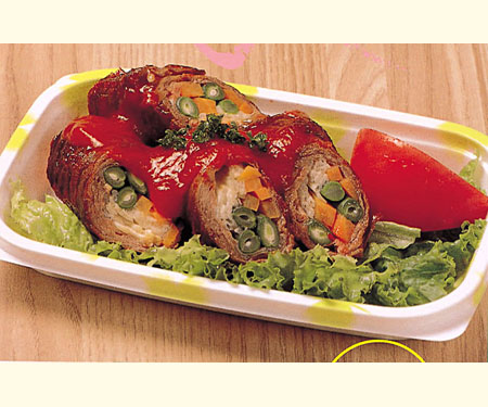コメント(国産食肉を活用したポイント) : とろみのある餡をとじこめて、脂肪の少ない牛もも肉がおいしさアップ! 冷めてもジ ューシー感が楽しめます。