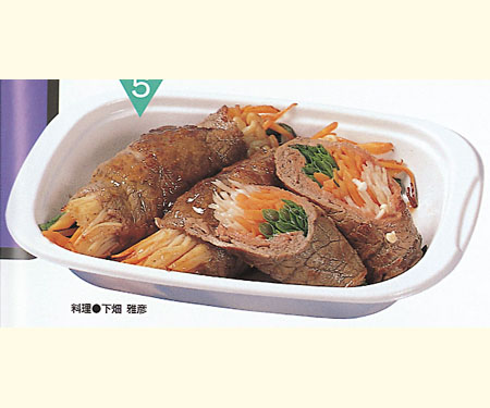 特徴 : 2種類のキノコを牛肉で巻いて、だし入りしょうゆで味をつけ る。巻く時に青じその葉も巻きこみ、味にアクセントをつける。