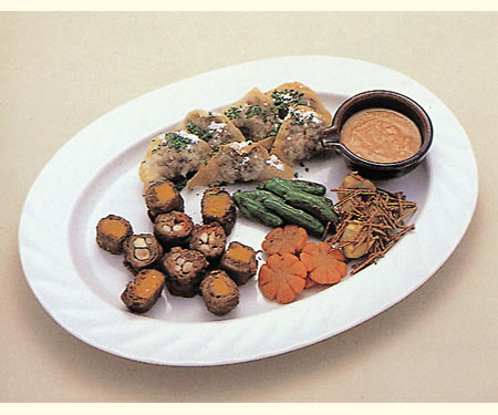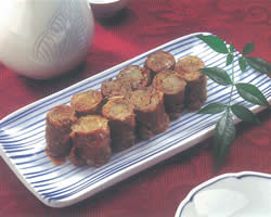 特徴 : 牛肉で巻いたものをさらに春巻きで巻いて揚げたもの。