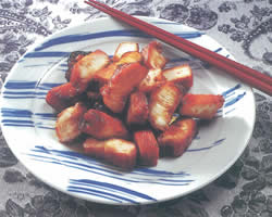 特徴 : 調理に時間がかかる角煮を、薄切り肉を使って早くおいしくできるよう工夫しました。 コクを出すためにタレをからめ、旬の野菜もとり入れて季節感を出します。