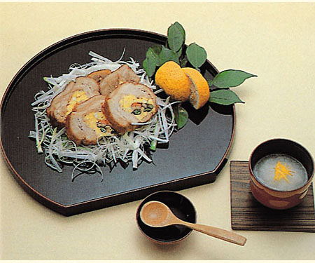 荏胡麻豚をもちで包みました。野菜と一緒にえごまあんにつけながら食べる豚肉のだんごです。 COMMENT 薄切りの豚肉で団子を作ってあるのでやわらかく、老人や子どもにも食べやすいでしょう。えごまの味に注目です。(江上)