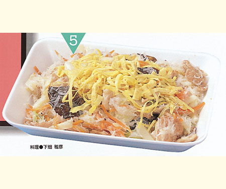 特徴 : 千葉の郷土料理の太巻寿司にちなんで、千葉野菜をたっぷり使い、肉を2種使い、巻き寿司 風にしました。