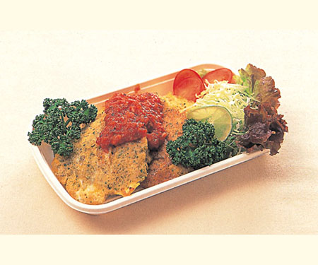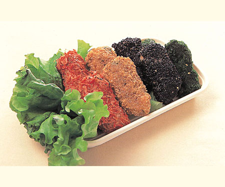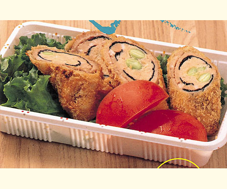 特徴 : 山形を代表する食材(肉、果物、野菜、米)をふんだんに使った新しい惣菜です。 国産のおいしい豚肉を麸をつけて揚げることにより、吸油量を少なくし、ヘルシーにカリッと食べることができます。