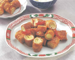 特徴 : 野菜嫌いの子供たちにも無理なく食べられるように、肉と野菜、さらに、きのこなどを たくさん混ぜました。 惣菜ということで、白いご飯にも合うように調味料を加え、冷めてもおいしく食べられる おとし揚げです。
