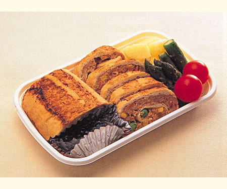 特徴 : 甘辛い味付けと、韓国のり、大葉の風味が食欲をそそります。 タケノコとパプリカの食感も良く、冷めてもおいしく食べられます。