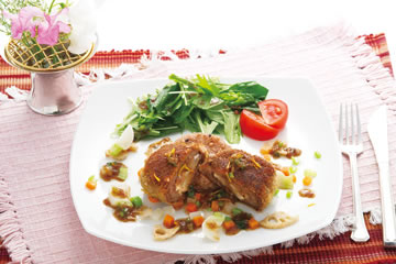 岩手県産前沢牛で豚、鶏、ねぎ、干ししいたけを包み、柔らかく仕上げました。ソースに干ししいたけの戻し汁を利用し、血圧の抑制になっています。