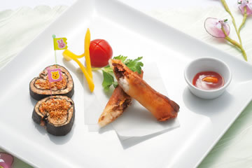 <審査委員からのひとこと>開港150周年を記念してできた「たねまる」キャラクターを飾り巻きずし風に牛肉で巻いた楽しい作品です。(梅村) |